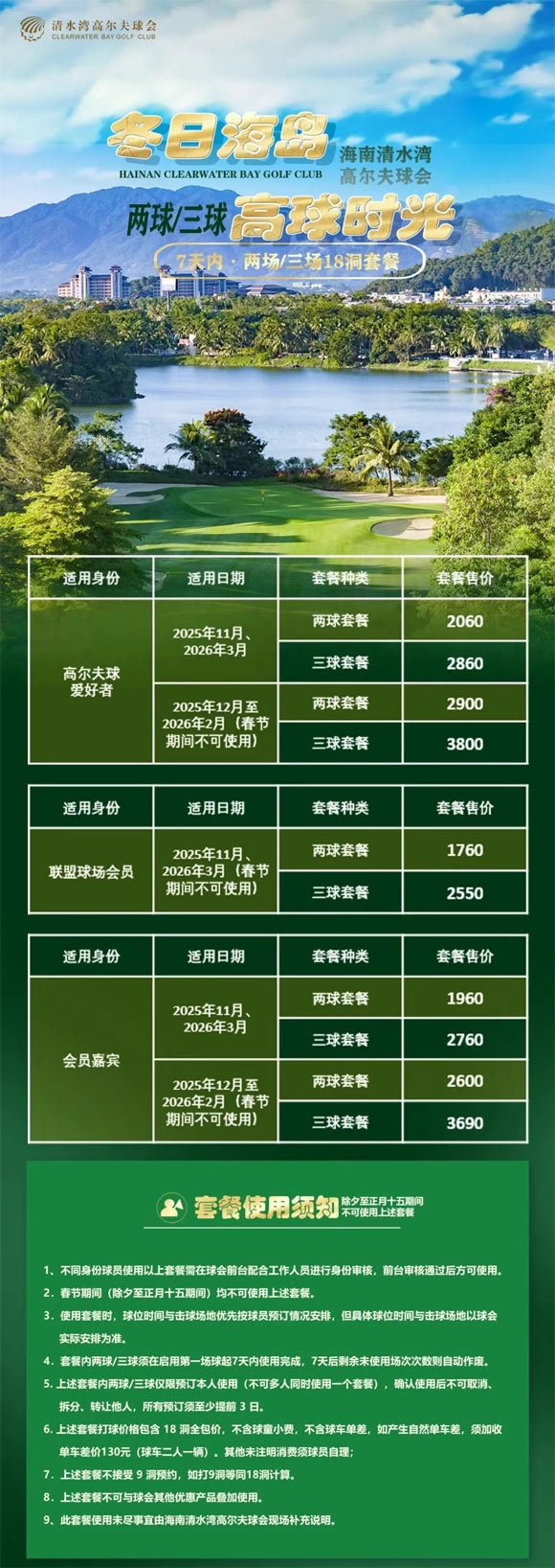 冬季的清水湾阳光温和,椰风裹着青草香,绿茵场上是最合适挥杆的温度。海南清水湾高尔夫球会特别推出「两球/三球套餐」,2025年11月1日起至2026年3月31日(春节期间不可使用),覆盖不同需求人群,性价比拉满,助您畅玩冬季高球时光!