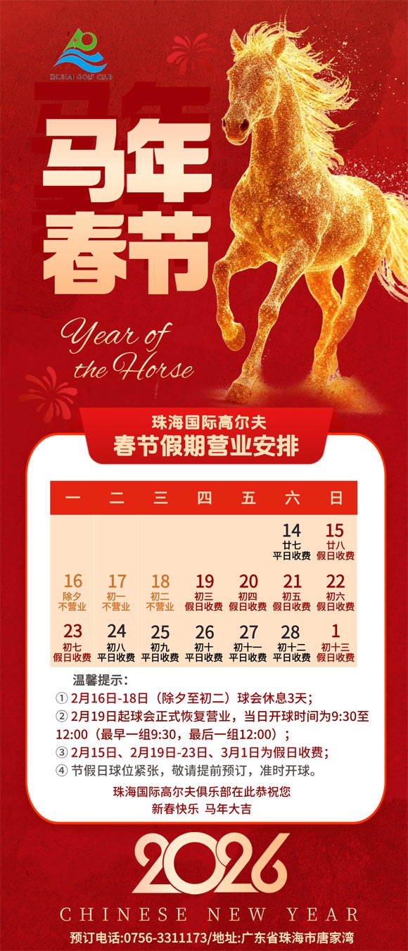 2026年珠海国际高尔夫春节假期运营安排