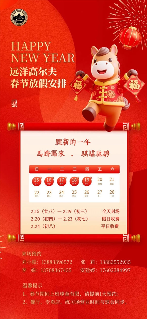 2026远洋重庆国际高尔夫球会春节放假安排!