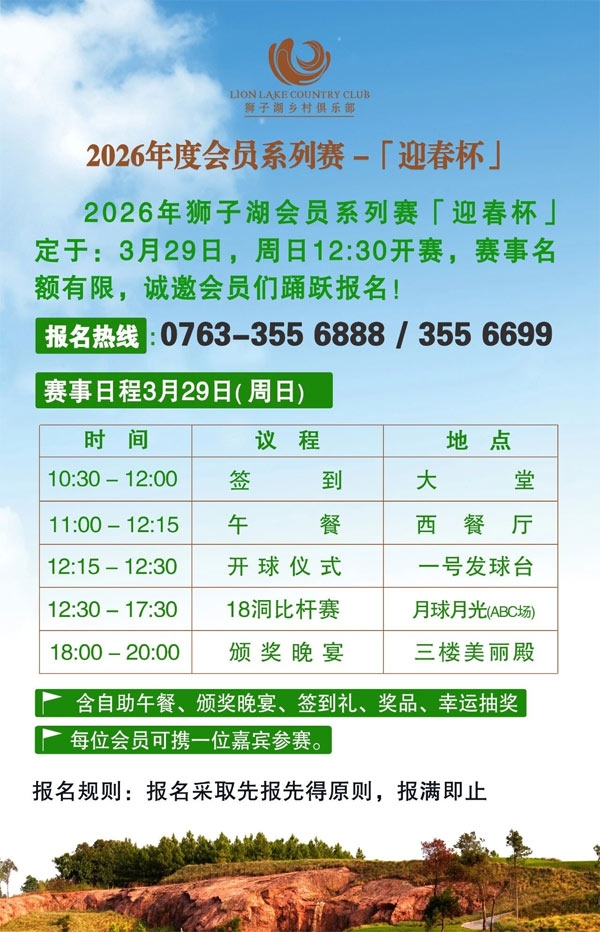 狮子湖乡村俱乐部2026会员年度系列赛「迎春杯」定于3月29日(周日)12:30开球。名额有限,额满即止。