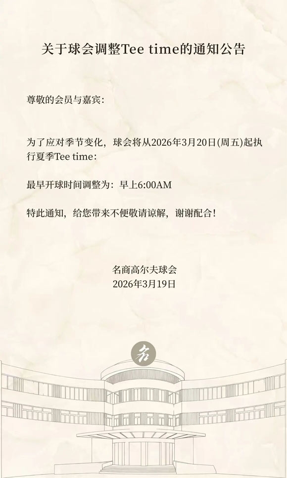 通知 | 名商高尔夫球会3月20日起执行夏季Tee time!