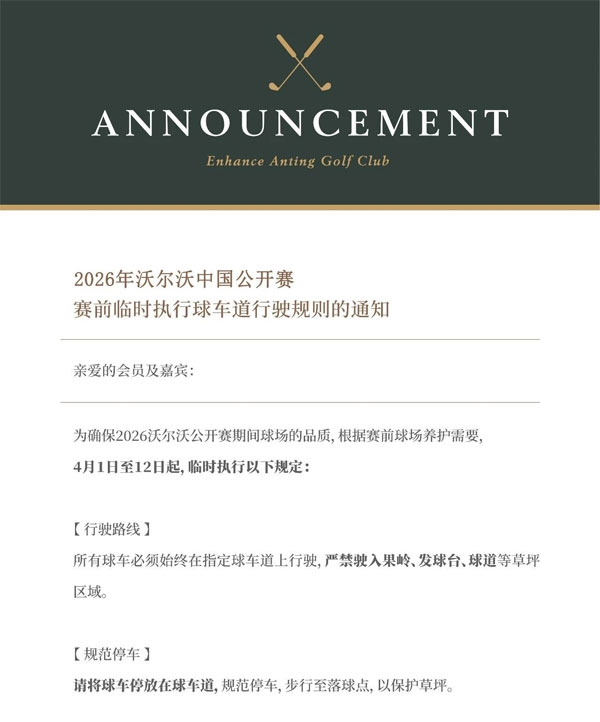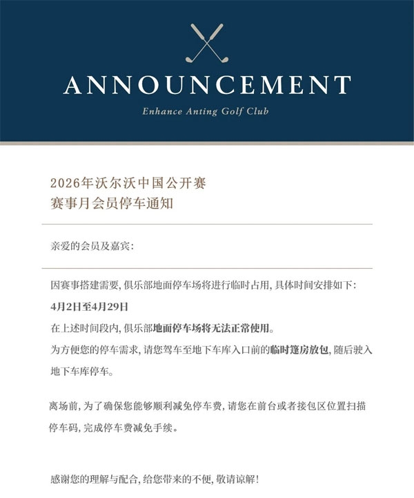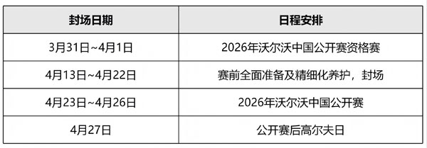 2026年沃尔沃中国公开赛将于4月23日(周四)至 4月26日(周日)在俱乐部举办,为保障赛事品质及球场养护,俱乐部将于以下时段实施阶段性封场: