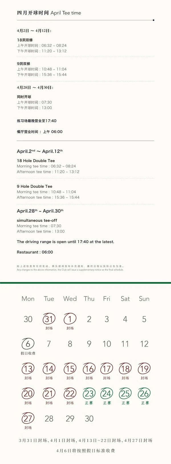 上海颖奕高尔夫四月赛事封场及球场运营安排