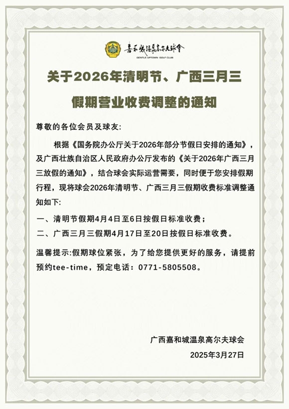 嘉和城温泉球会2026年清明节、广西三月三假期营业收费调整的通知!