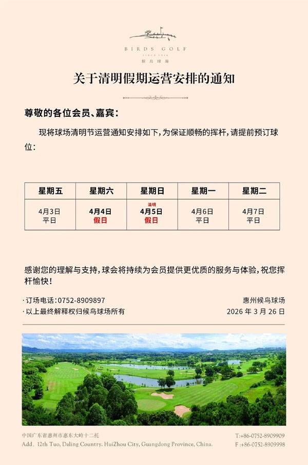 惠州候鸟球场关于清明假期运营安排的通知