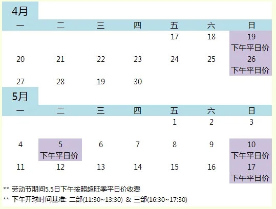 为缓解周末及节假日打球客流量集中,球位紧张等情况,优化服务体验,保障更优质的击球环境与运营标准,球场将于4月17日~5月17日期间,对全体顾客推出周日下午按平日价格收费的活动,具体活动日期请参照下图。
