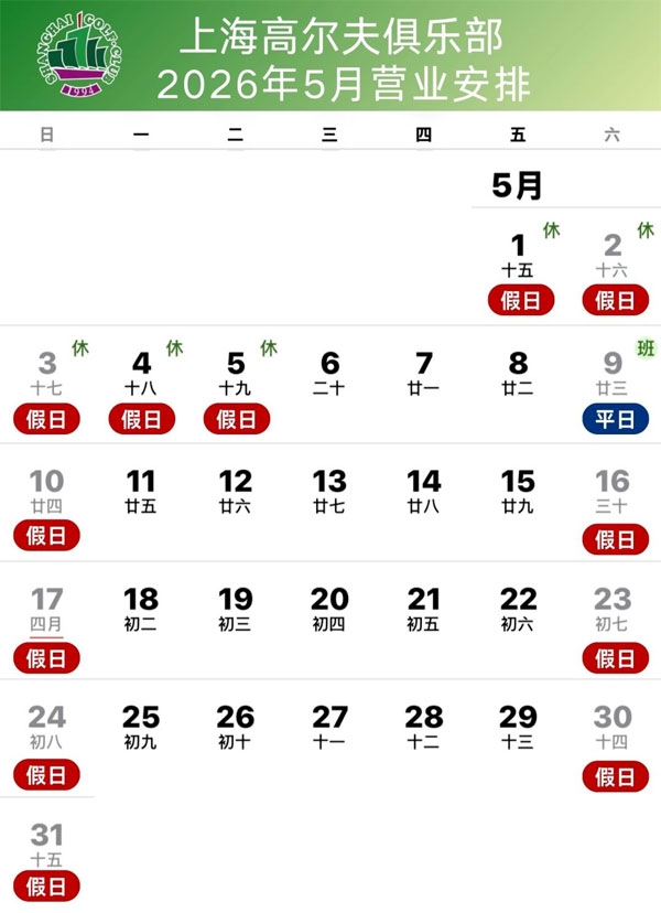 上海协和高尔夫俱乐部五月营业安排