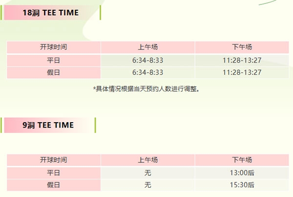 *以上九洞开球时间仅作为参考,实际九洞发组时间以当天俱乐部预约情况为准,具体视出发台安排,感谢各位会员及嘉宾的理解和支持。