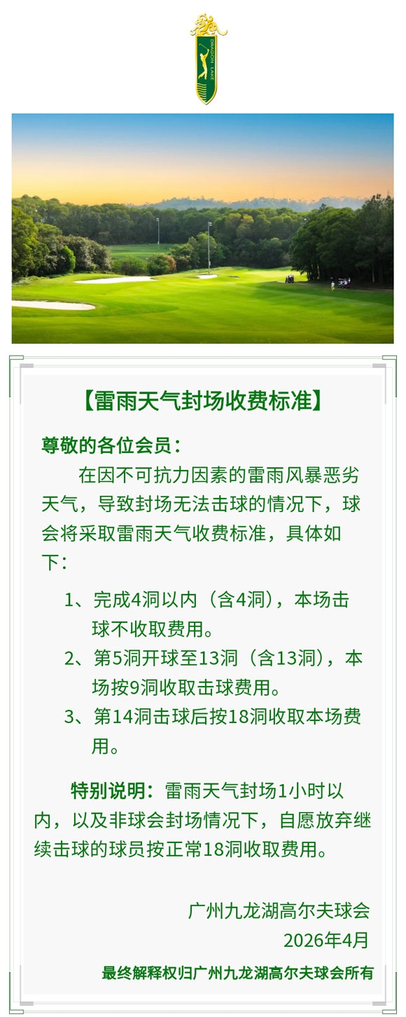 公告 | 广州九龙湖高尔夫球会雷雨天气封场收费标准!