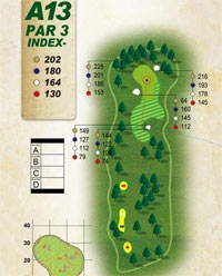13号美人梅洞:3杆洞 彩叶树种,增添周围景色,这是一个只能用“酷”来形容的球洞。站在发球台上,果岭右前方的沙坑与果岭左边的沙坑遥相呼应…