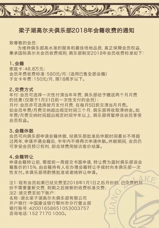 湖北梁子湖高尔夫球会2018年会籍收费通知