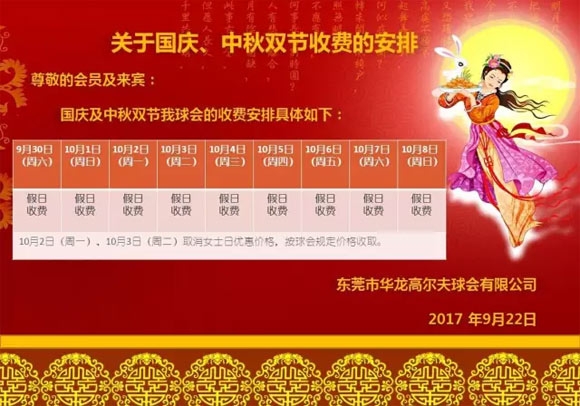 东莞华龙高尔夫球会2017国庆&中秋双节收费安排