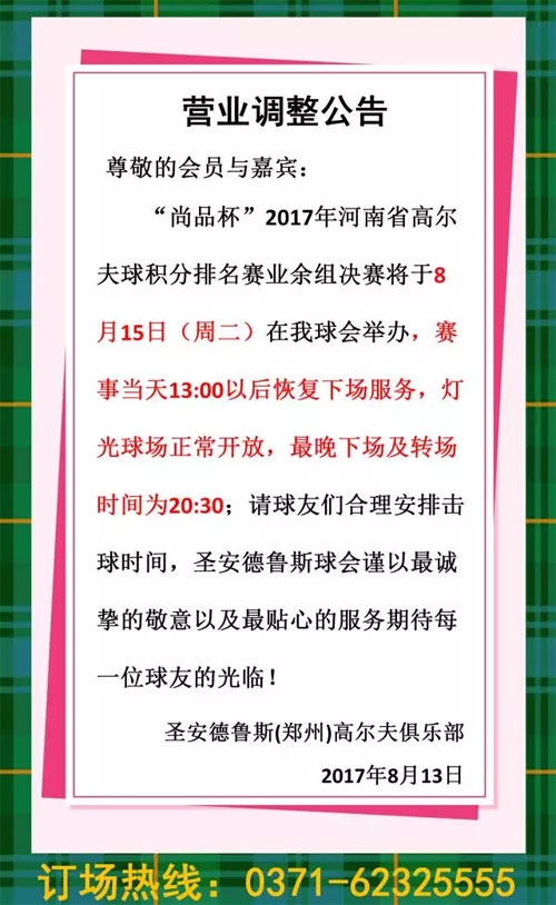 郑州圣安德鲁斯高尔夫8月15日赛事期间营业调整