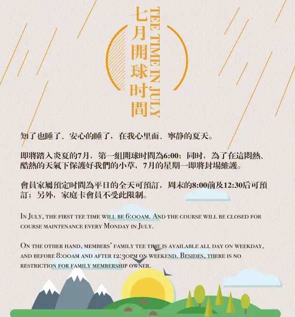 尊敬的会员和嘉宾: 七月骄阳,消暑挥杆,畅快淋漓!为了给您和嘉宾提供更多畅享挥杆的机会,2017年7月份的Tee-Time(打球时间)通知如下: 假日最早一组开球…