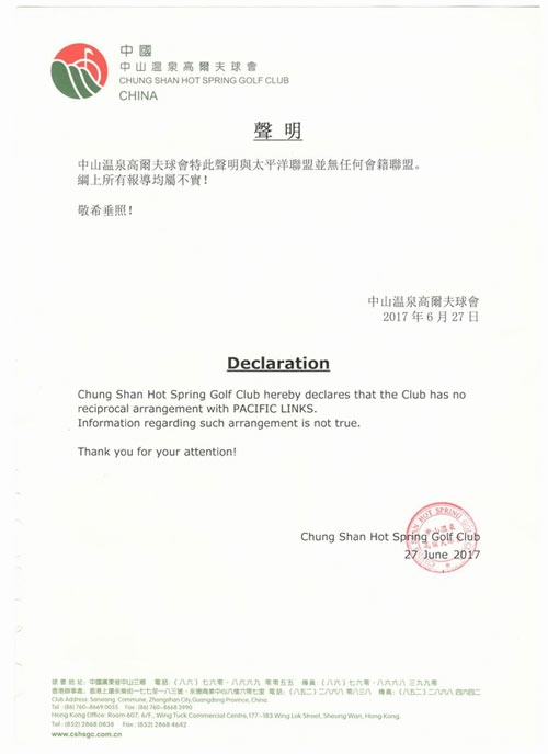 北京时间6月27日消息。中山温泉高尔夫球会今日发布声明,全文如下——