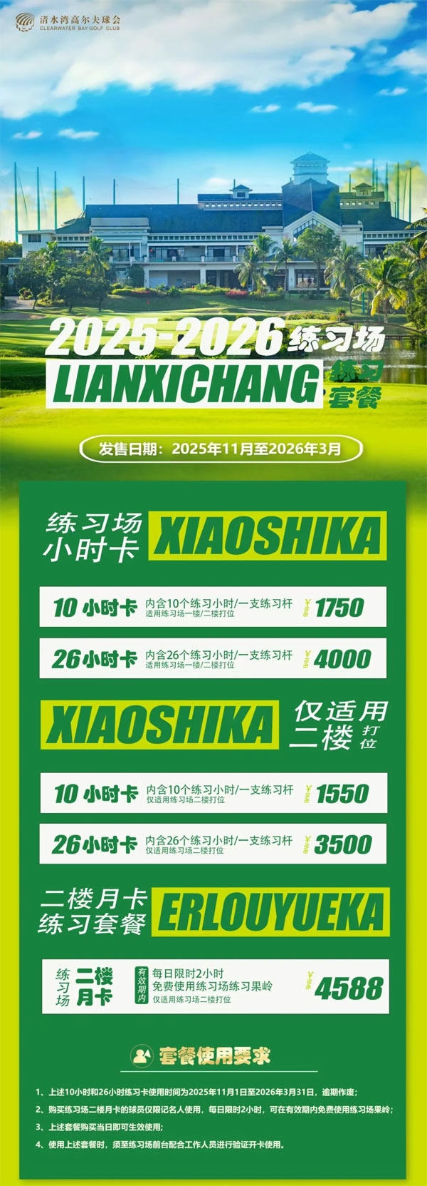 即日起球会练习场推出「练习场小时套餐卡」和「练习场二楼月卡套餐」!
