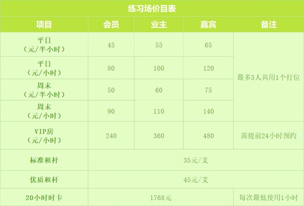 ·专业配套:无需自带装备,租杆服务齐全,VIP私密打位提前24小时预约,独享静谧挥杆空间