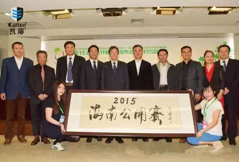 签约仪式结束后,发布会进入到最激动人心的时刻,由凯旋体育文化书法顾问、中国书画家协会主席吴海涛先生亲笔书写的匾额“海南公开赛”徐徐揭开帷幕,这标志着2015年“海南公开赛”整个赛季的正式起航。让我们祝贺海南公开赛正式起航。