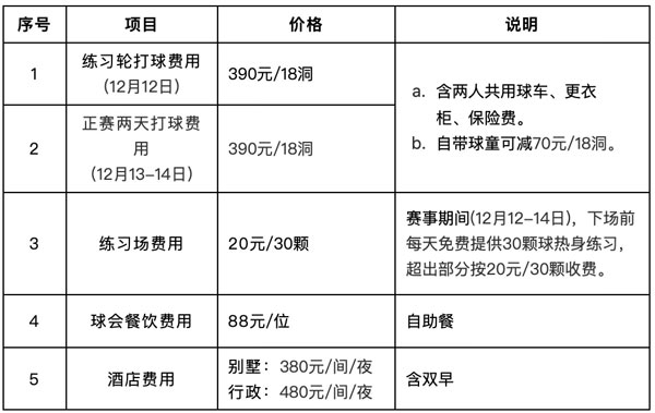 4、赛事服务费:680元/人(各参赛球员差旅费、食宿费、打球费、球童小费等各项费用自理。)