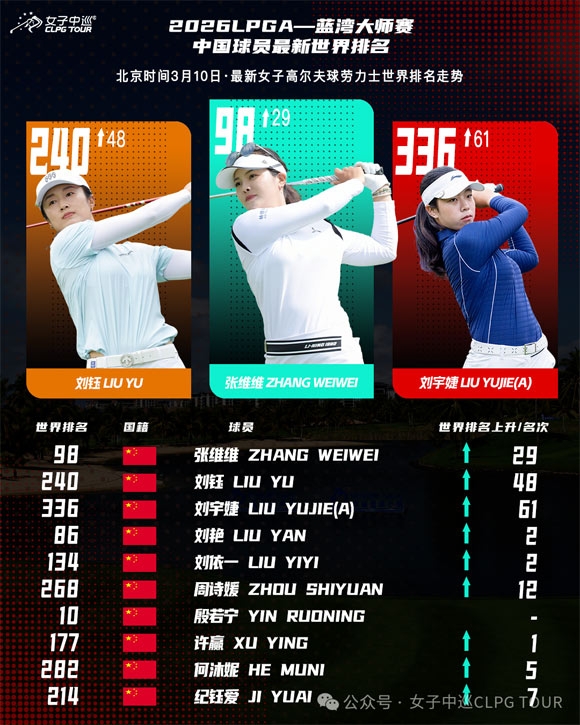 北京时间3月10日,最新一期女子高尔夫球世界排名正式公布。刚刚结束的2026 LPGA-蓝湾大师赛为世界排名格局带来新的变化,多位中国球员在主场赛事中取得积分,世界排名随之迎来不同幅度提升。