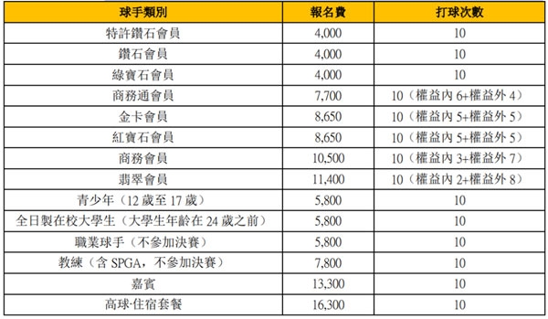 报名费(人民币)- 包括10场平日球赛的果岭费、球僮费、双人球车费及更衣柜费(单人球车费50元/人)