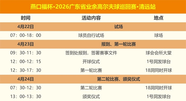 燕口福杯·2026广东省业余高尔夫球巡回赛·清远站即时起开启报名,关注广东省业余高尔夫球巡回赛公众号,获取更多参赛信息。