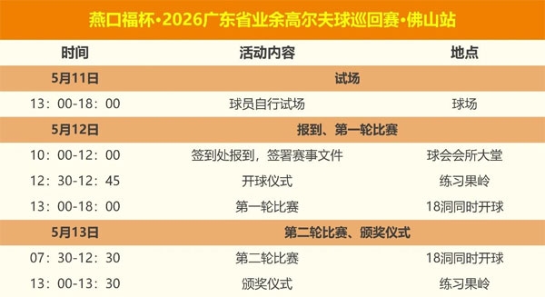燕口福杯•2026广东省业余高尔夫球巡回赛•佛山站即时起开启报名,关注广东省业余高尔夫球巡回赛公众号,获取更多参赛信息。