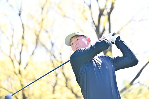 比赛第一轮在早上7点开启。17岁山东选手杨明源从12号洞出发,前9个洞拿下4只小鸟,占据榜首。随后在3号洞(177码,Par 3),他用6号铁开球,把小球放在洞边,轻松推进半码的小鸟推。紧接着4号洞(640码,Par 5),他在错过标准杆上果岭的情况下,20码外直接切进小鸟,实时成绩打到-6杆!遗憾的是,7号洞,他出现失误,吞下双柏忌,但依然以68杆(-4)取得第一轮领先。